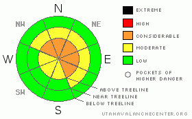 There is a CONSIDERABLE avalanche danger today on steep, upper elevation slopes with recent deposits of wind drifted snow. Human triggered avalanches are probable especially in terrain above treeline on slopes facing east, north, northeast and southeast.