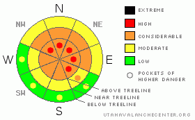 At mid and upper elevations the avalanche danger is CONSIDERABLE and human triggered avalanches are probable. In the wind zone above treeline a HIGH danger exists and human triggered slides are likely. In either case, avalanches triggered today will be large and dangerous. In lower elevation terrain the avalanche danger is MODERATE on any steep, wind drifted slope and human triggered avalanches are possible.