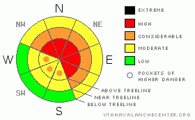 Notice: An Avalanche Warning remains in effect for the western Uinta Mountains. Strong winds overloading a weak snowpack has created a HIGH avalanche danger. Dangerous human triggered avalanches are likely. People should avoid steep wind drifted slopes. |