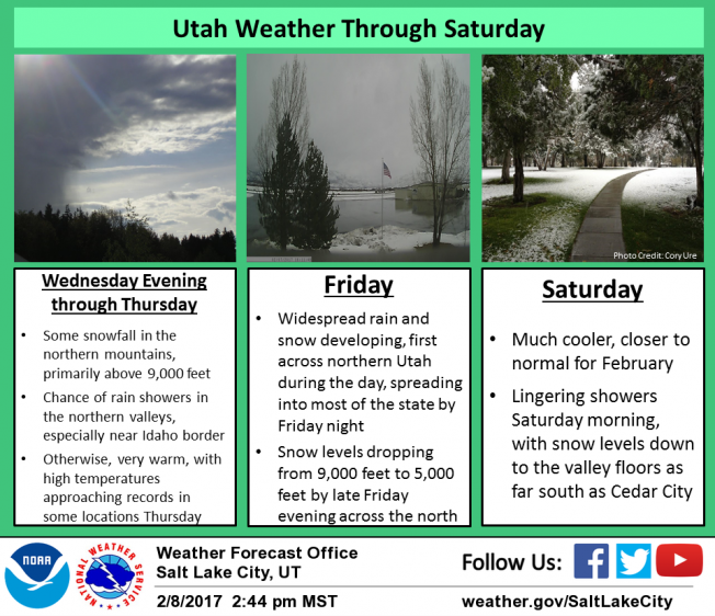 weather Warm air filters into the region and high temperatures reach into the mid 40's. Southwest winds continue to be a nuisance along the ridges, blowing in the 40's and 50's. Snow levels climb very high for this time of year, bringing rain to unusually high elevations. Moisture increases on Friday with a cold front pushing through the region early Saturday, bringing a brief period of snow.