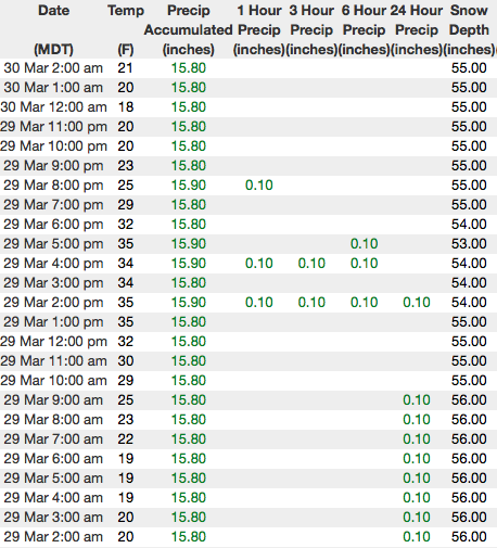 current conditions Skies are clear and an amazing moon awaits as you walk out the door this morning. Temperatures hover in the low 20's and westerly winds are blowing in the 20's and 30's. Sunny slopes offer smooth, suportable, corn-like conditions that soften with strong springtime sun. Whilst on the other half of the compass, soft shallow snow is found on upper elevation wind sheltered, shady slopes. Above are 24 hour temperatures and snow depth near Trial Lake along with winds and temperatures from Windy Peak. More remote Uinta weather stations are found here A great body of recent trip reports, observations, and snow data here. |